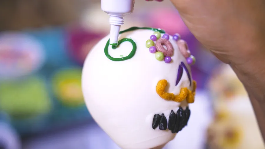 Think about your calaveritas designs first. You can lay out each design using small-sized candy, sprinkles, Gluten Free Fruity Cheerios™, nuts and colorful edible decorations on top of parchment or wax paper.