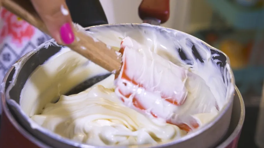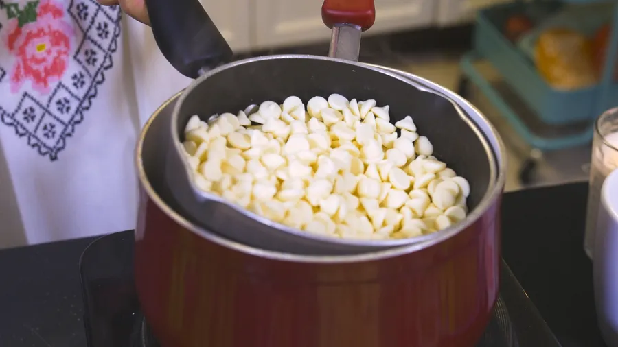 Melt the white chocolate in a heat-resistant bowl on top of a double-boiler over medium heat, keeping in mind you have to constantly stir with a spatula and avoid getting any moisture inside the bowl where the chocolate is.