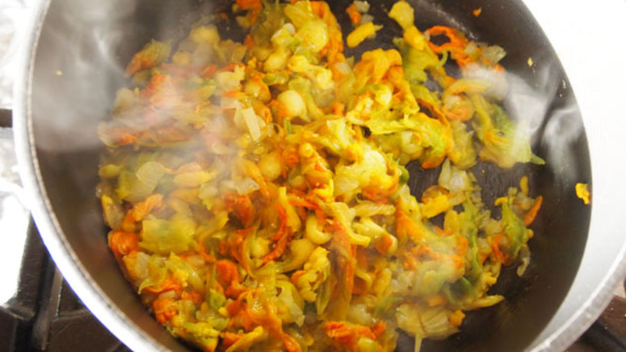 In a frying pan, heat the oil over medium heat. Fry the onion until it’s bland. Add the flowers and shredded zucchini, stirring ntil bland and well cooked. Season with salt and pepper, to taste.