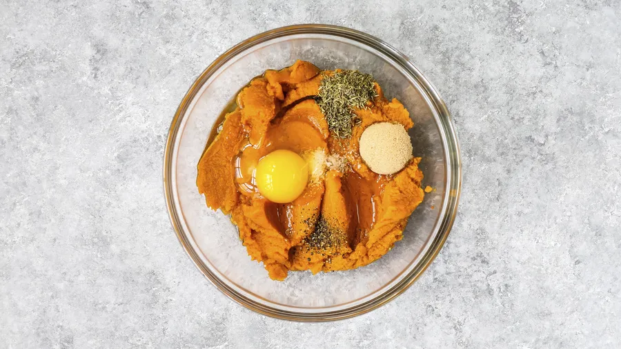 Put the puree, brown sugar, sage, salt, pepper, 1 cup of breadcrumbs and 1 egg into a medium bowl, and mix. Put this in the fridge for at least 1 hour.