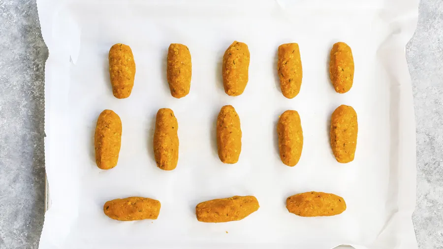 Divide the mixture into 14 parts. Using your hands, shape the nuggets into cylinders. Put them on a tray or on a big dish and put this in the fridge for another 30 minutes.