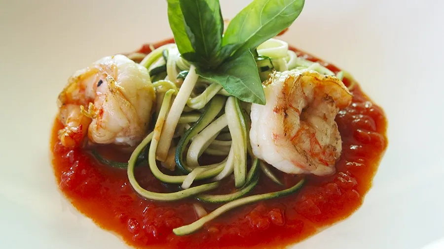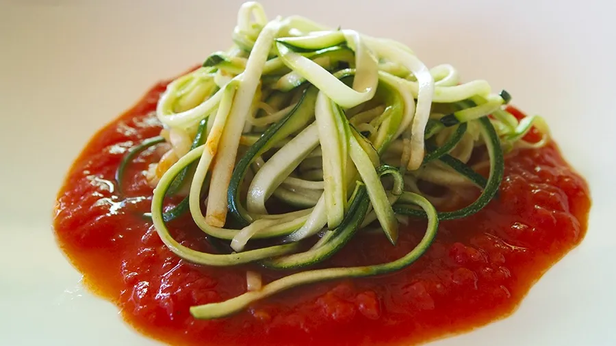 In a plate, pour the hot tomato sauce. Place the hot zucchini noodles over the sauce.