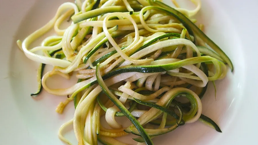 Wash the zucchini well and slice it lengthwise. Afterwards, cut each slice in medium-sized threads so that the zucchini looks like noodles.